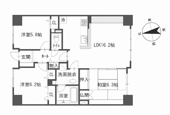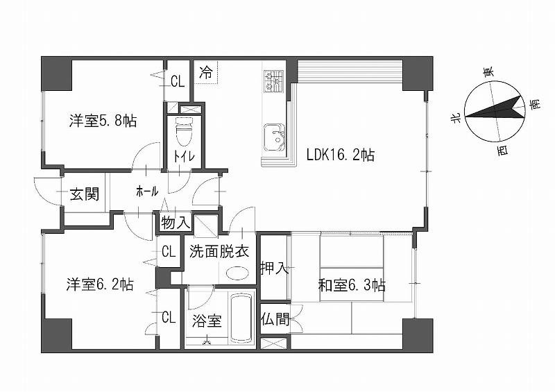 | 間取り詳細 | LDK16.2帖、和6.3帖、洋6.2帖、洋5.8帖、WC、洗面、浴室 |